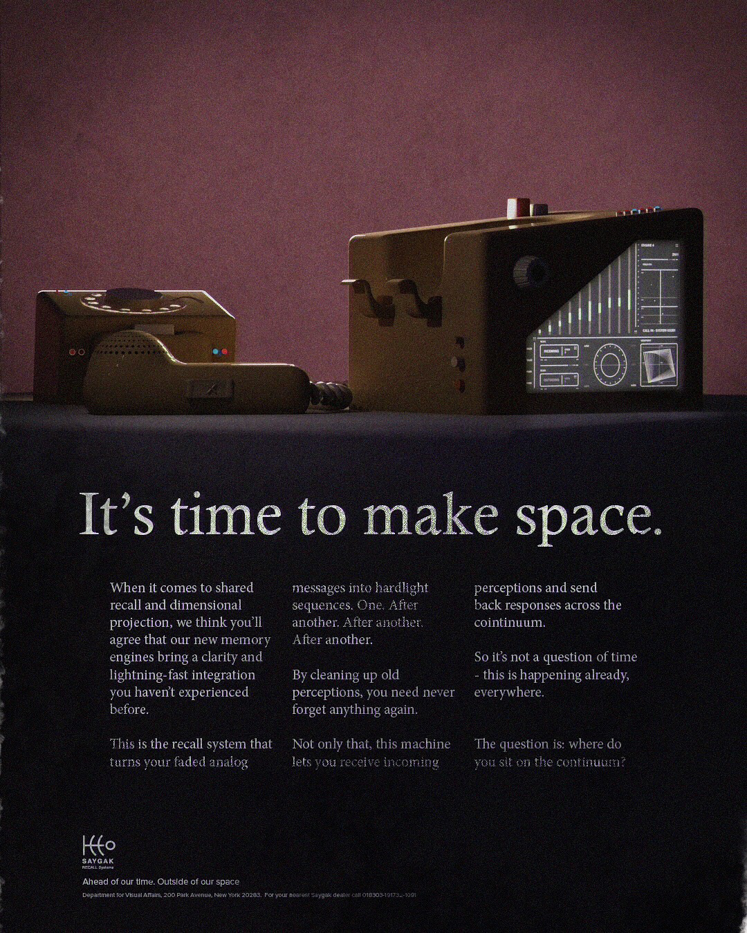 As I work through a personal project it becomes less about the initial idea and more about the world I've started inhabiting. This was the case as I built out the world that the Saygak machine and others were in - indeed, the time they seemed to belong in. A time when analogue crossed into digital, a time of groundbreaking filmmaking and new forms of advertising. These mock adverts emulate both the cinematography of the era but also the Madison Ave approach to copywriting.